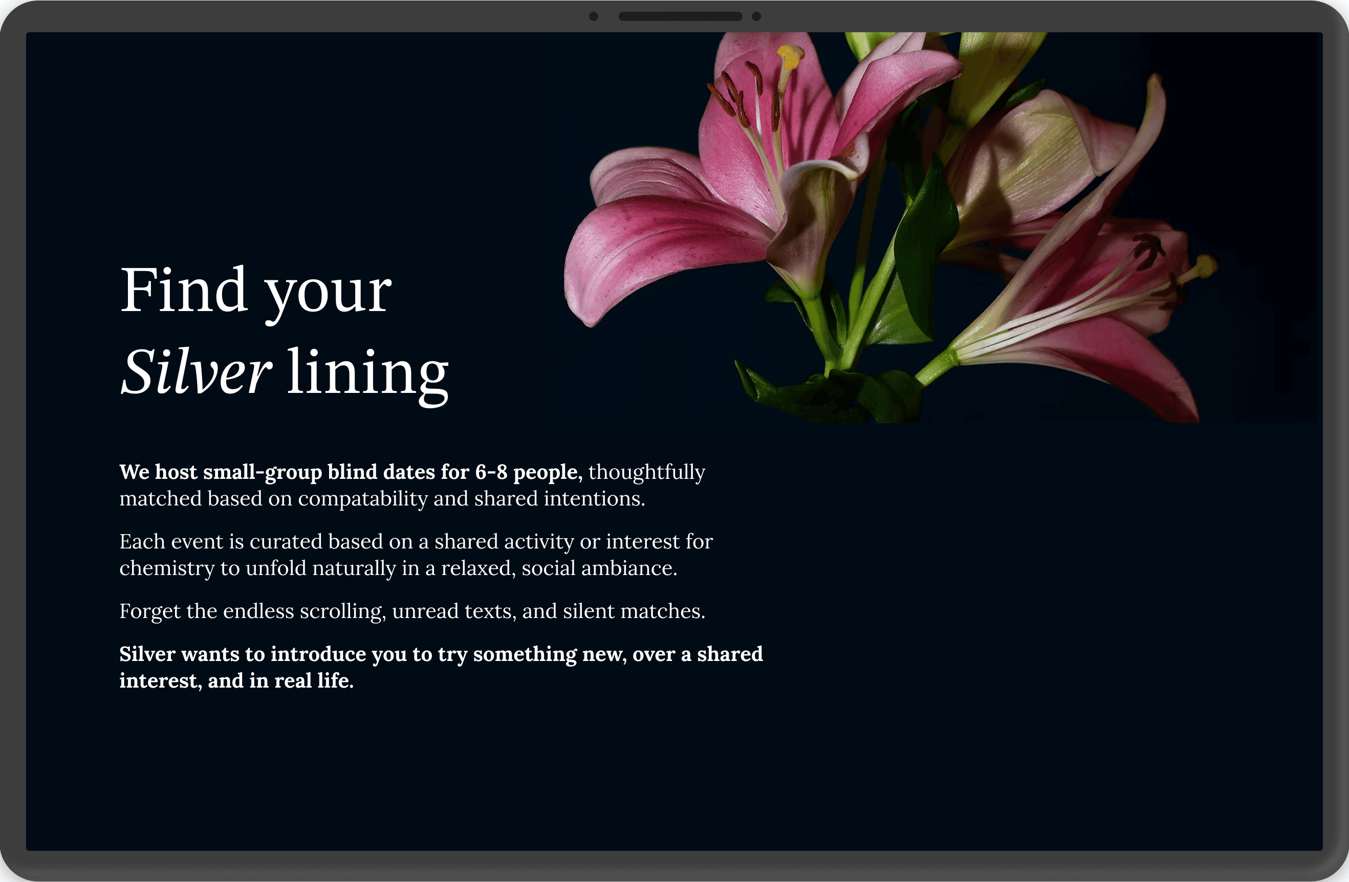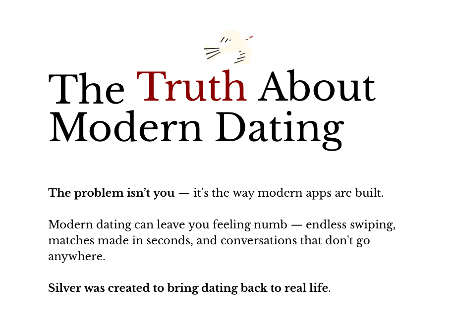 Silver is an event-organizing and dating app that plans group blind dates, inspired by Korean sogaeting dating norms.